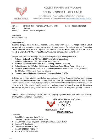 Surat pengaduan ini juga ditembuskan ke berbagai instansi, mulai dari BPJS Kesehatan dan BPJS Ketenagakerjaan Jawa Timur, Kepala Dinas Tenaga Kerja dan Transmigrasi Jawa Timur, hingga Satpol PP serta sejumlah OPD di Kabupaten Kediri.
